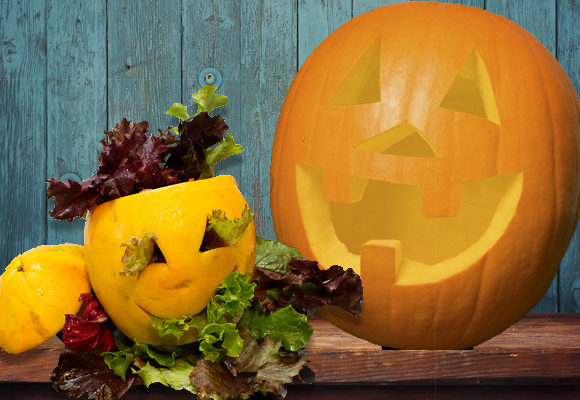You can make this papaya "pumpkins" cute or scary. I personally like the lettuce eyelashes on the Solo papaya. The salad inside is delish....